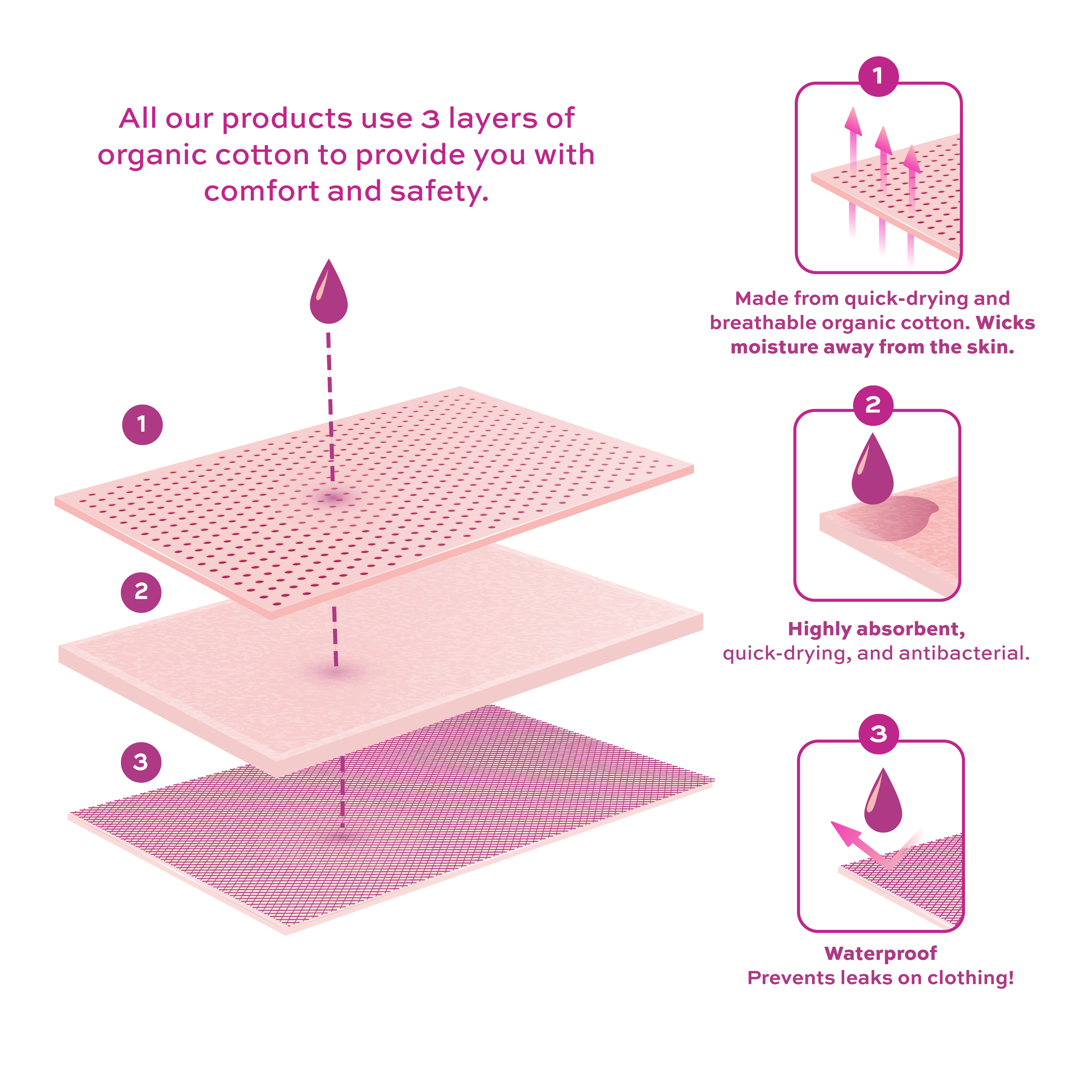 They are made with quick-drying, waterproof, breathable, biodegradable, and antibacterial organic cotton that absorbs all kinds of liquids, such as menstruation, sweat, minor urine leaks, secretions, and other natural fluids.
